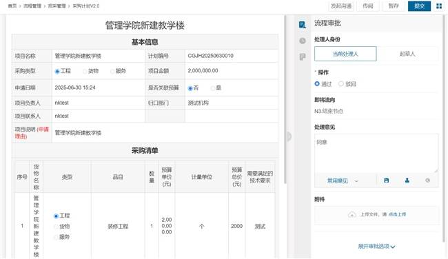 采购项目发起:经办人在线填写采购项目核心信息,关联已审批的采购计划与对应预算,上传招标文件、技术参数文件等资料,确保项目与计划、预算强绑定,避免脱离计划采购;
