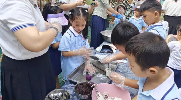 杭州市九欣幼儿园的小朋友们化身“小小糕点师”,在老师的带领下开启了冰皮月饼制作之旅。揉面团、包馅料、压模具……一个个晶莹剔透的冰皮月饼在孩子们手中诞生,宝贝们围坐在一起,开启了一场甜甜的中秋品尝会。