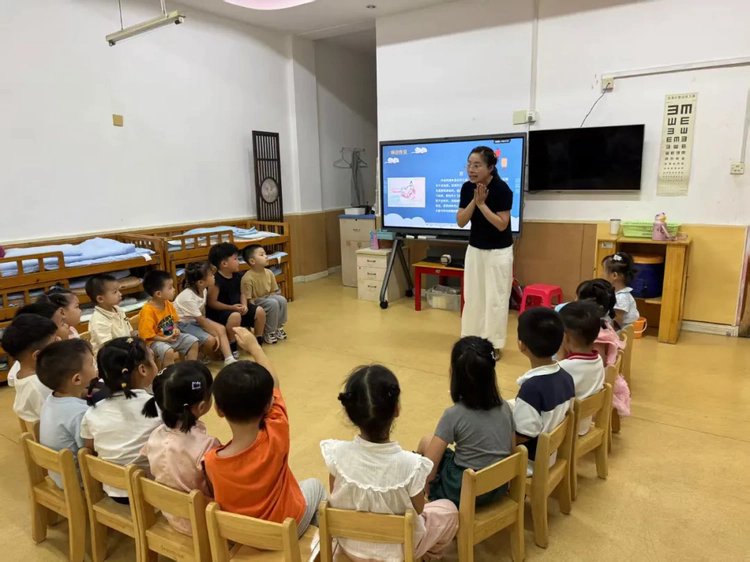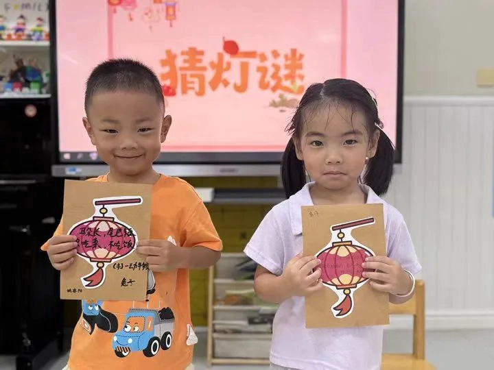 萌娃们用欢快的中秋儿歌传递节日喜悦,稚嫩的歌声里满是对月亮和团圆的憧憬;孩子们还将古诗与手势舞结合,一抬手、一投足间,让诗意缓缓流淌,让传统文化以童趣满满的方式走进孩子心田。“有时像圆盘,有时像小船,夜里挂天上......”猜灯谜活动热闹非凡,孩子们在猜谜乐趣中读懂中秋。